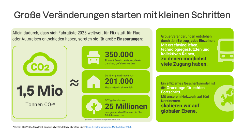 Im Jahr 2025 haben Flix-Fahrgäste in Deutschland, Österreich und der Schweiz schätzungsweise 224.000 Tonnen CO₂ vermieden – allein dadurch, dass sie sich für den Fernbus oder Fernzug statt für Auto oder Flug entschieden haben. Grundlage sind Berechnungen im Vergleich zu alternativen Verkehrsmitteln.[1] Weltweit geht Flix von 1,5 Millionen Tonnen vermiedenem CO₂ aus.